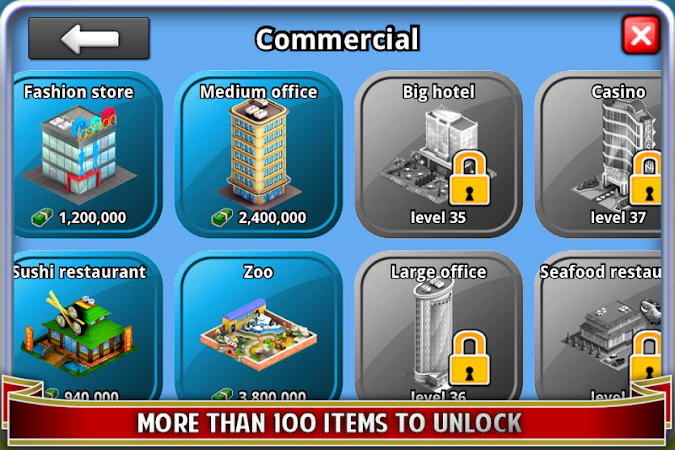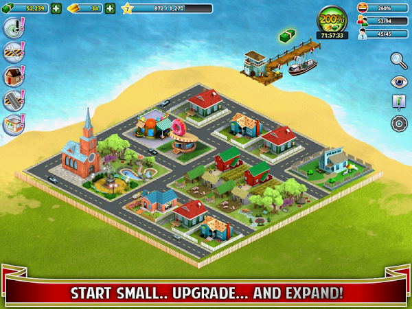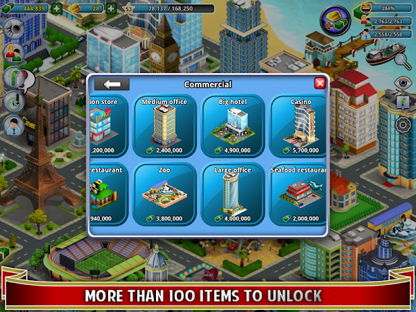 - Unlock and build from a list of 100+ Unique buildings (residential, commercial, farm, community, decoration, park, plants, township, beach and sea buildings like oil platforms and more)